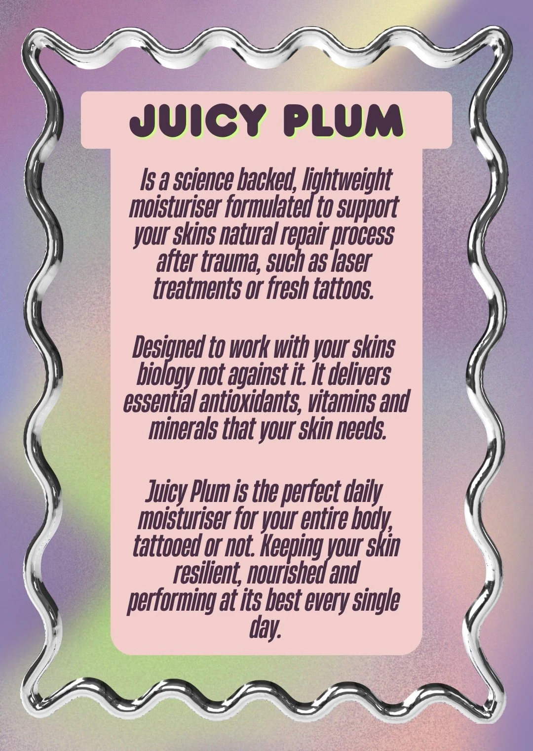 Juicy Plum isn’t just a moisturiser — it’s targeted recovery support for skin that’s been through ink or laser.